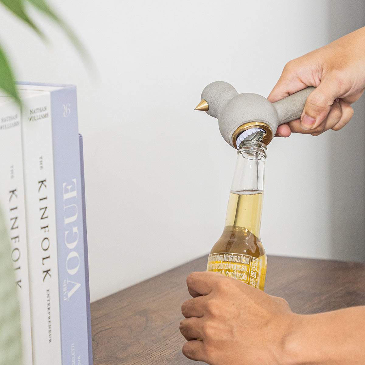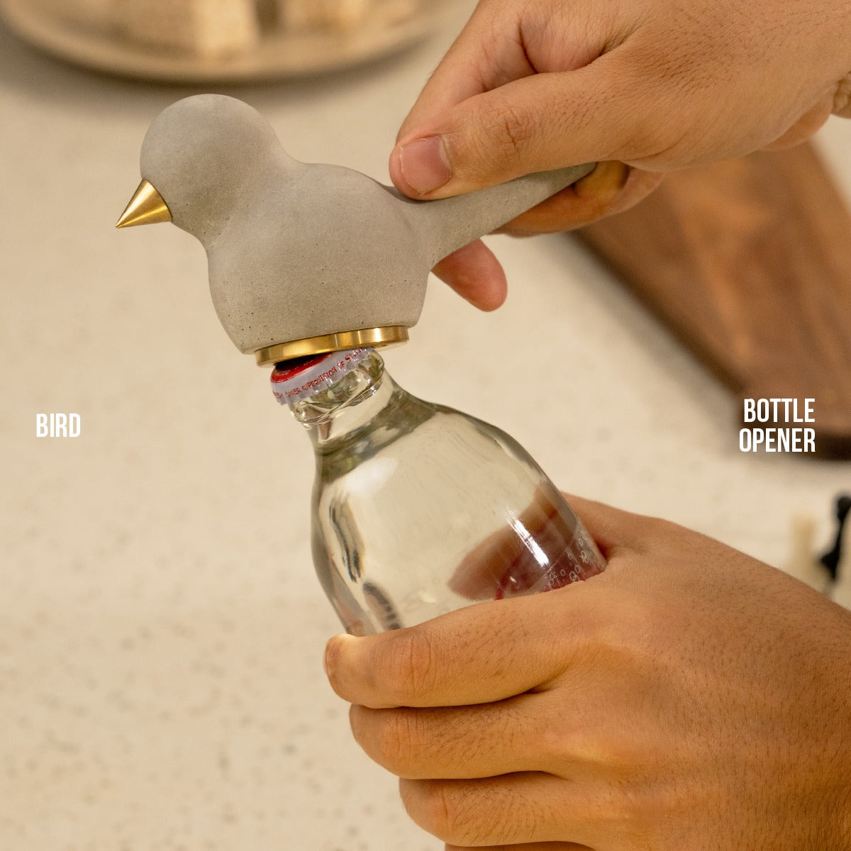 The Bird Bottle Opener begins with a precisely measured cement mixture, pressed to remove air bubbles and create a smooth, seamless surface. Each piece is then carefully demolded, sanded, and refined by hand. The beak and base are crafted from solid brass, offering both durability and quiet elegance. The base is finished with leather for a subtle touch of refinement. Every step of the process, from casting to assembly, is done with patience and precision, turning a simple bottle opener into a sculptural object of design.