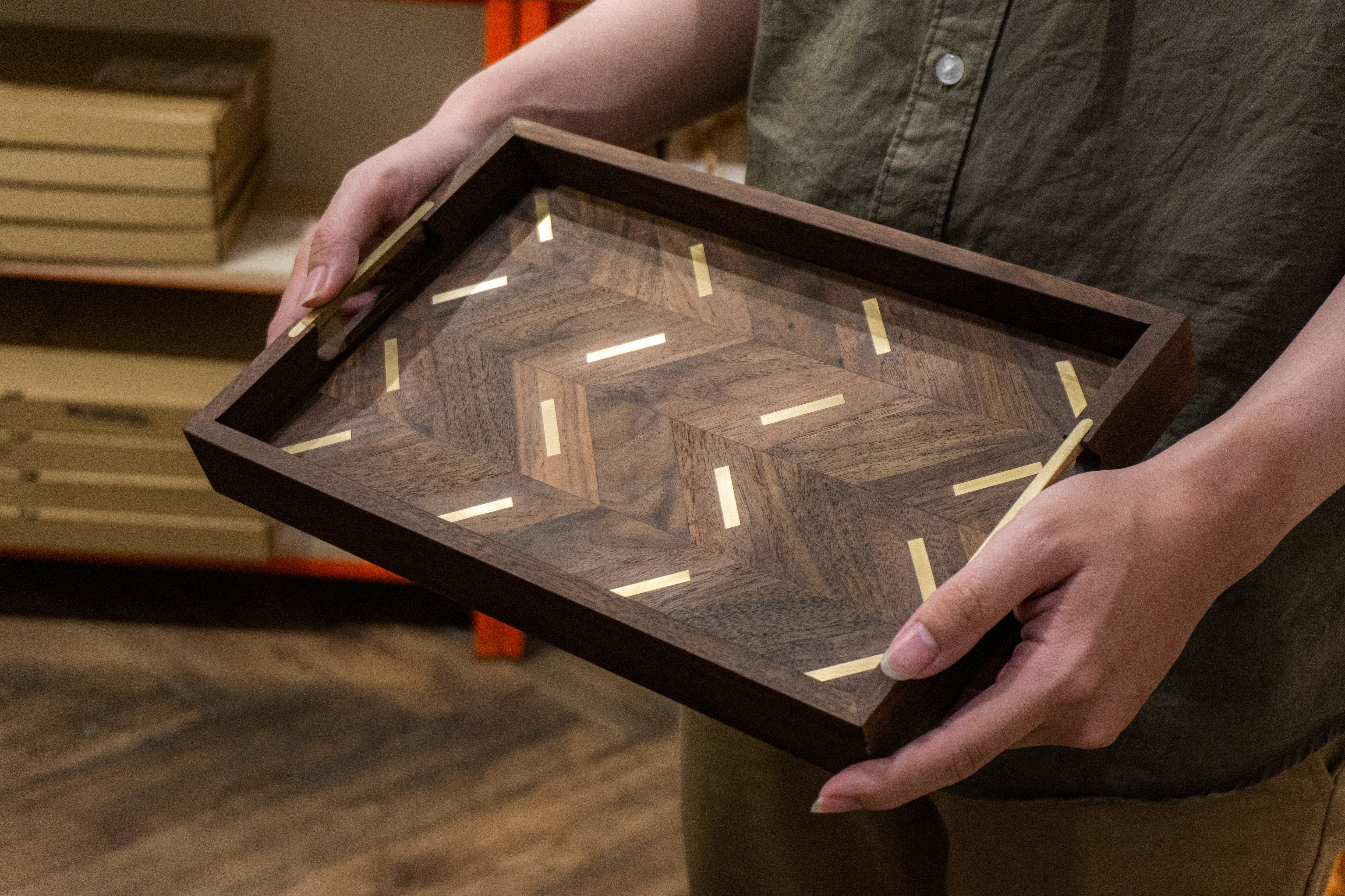 The Puzzle Tray is distinctive not only for its refined appearance, but for what it embodies. At its core lies a thoughtful design philosophy: waste less, design better—transforming walnut wood once considered too uneven in hue and brass fragments too small for conventional use into something enduring.
