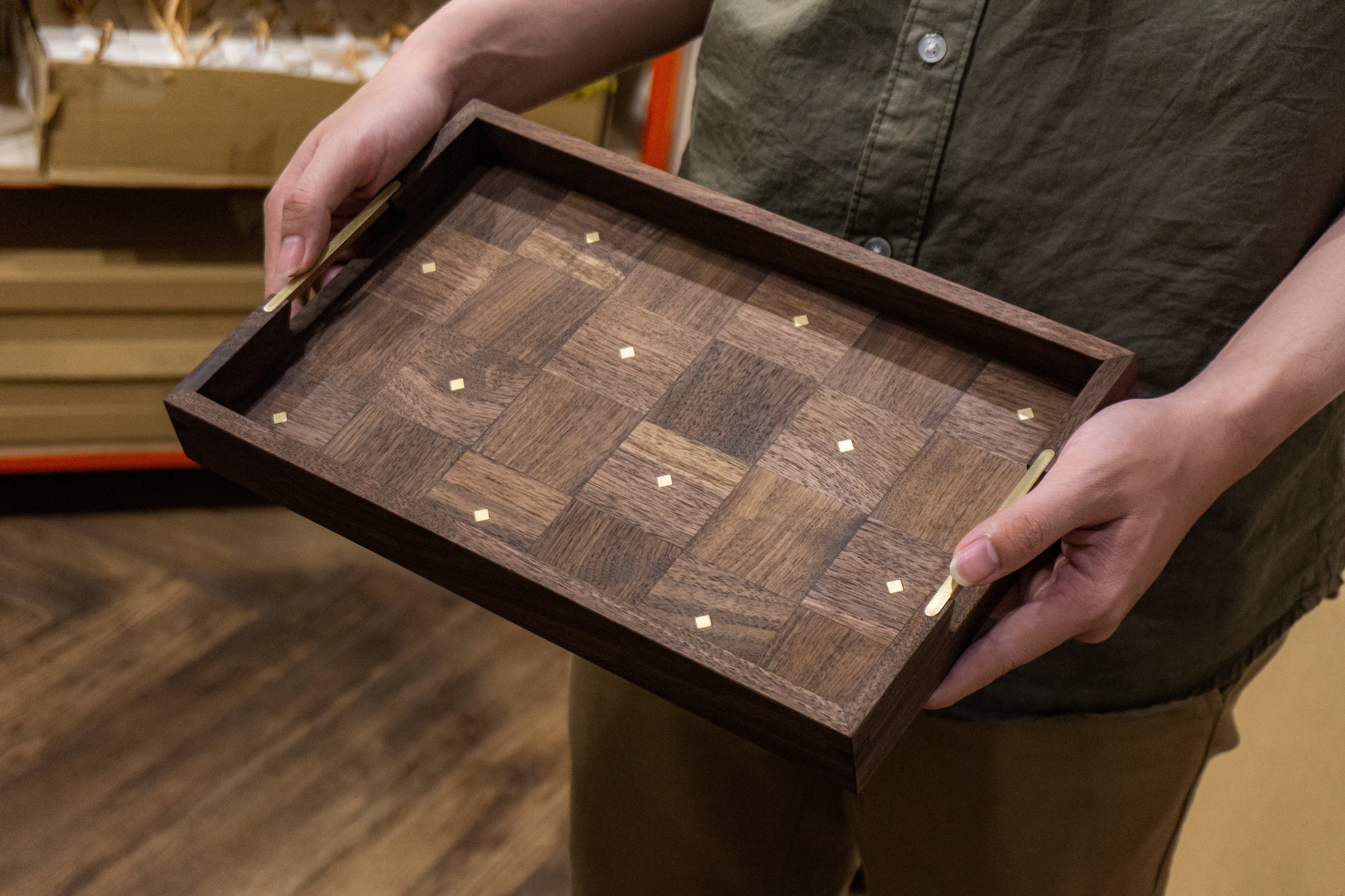 The Puzzle Tray is distinctive not only for its refined appearance, but for what it embodies. At its core lies a thoughtful design philosophy: waste less, design better—transforming walnut wood once considered too uneven in hue and brass fragments too small for conventional use into something enduring.